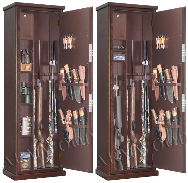 - Внутри сейфа есть запираемое (патронное) отделение и деревянные ложементы, можно дополнительно установить три съёмные полки (если полки не устанавливать в сейф помещается 5 стволов).